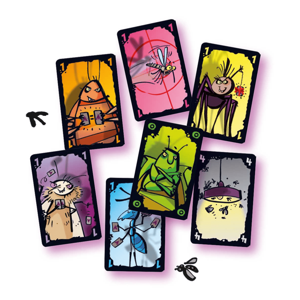 Haz que roben cartas extras con la hormiga, deshazte de una carta duplicada con la cucaracha, aplasta a los mosquitos de un manotazo o regala una de tus cartas a otro jugador con la araña.